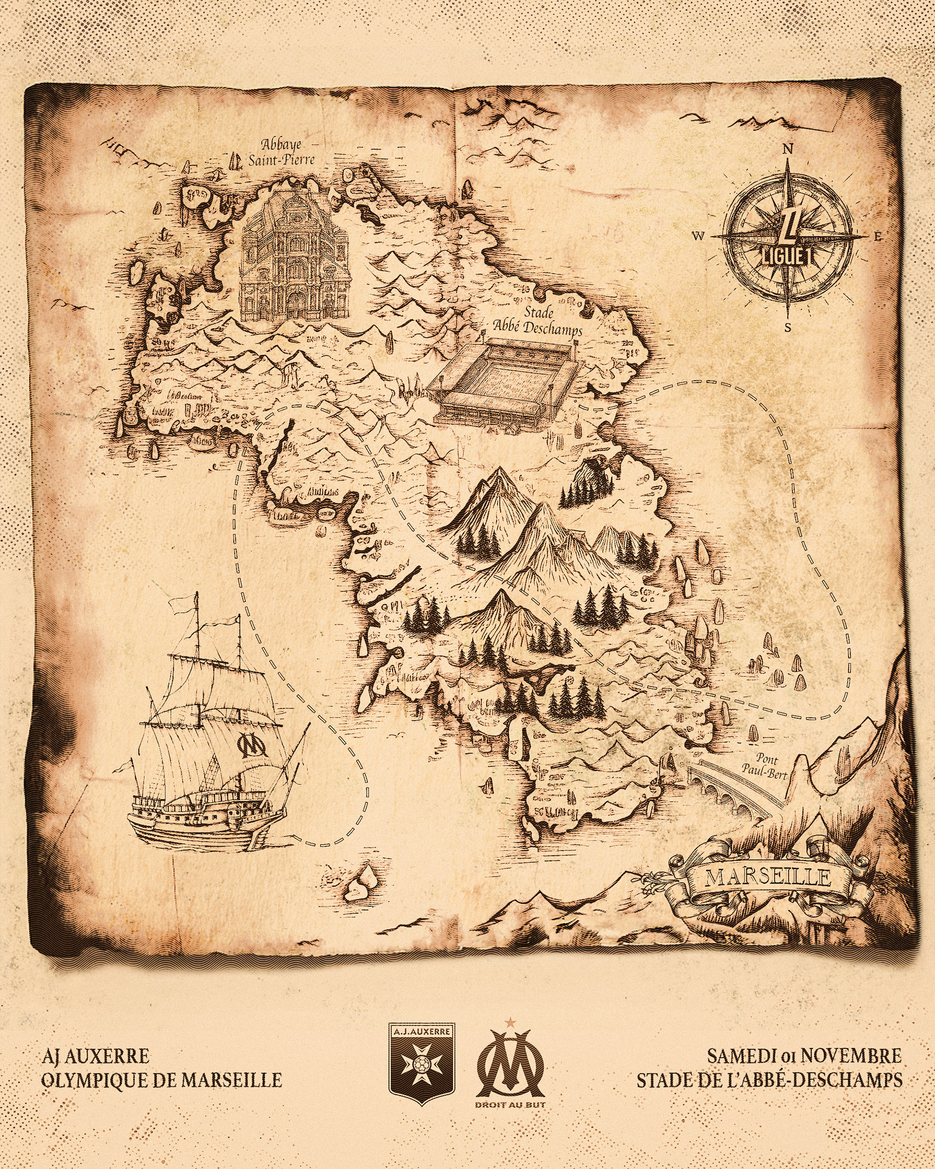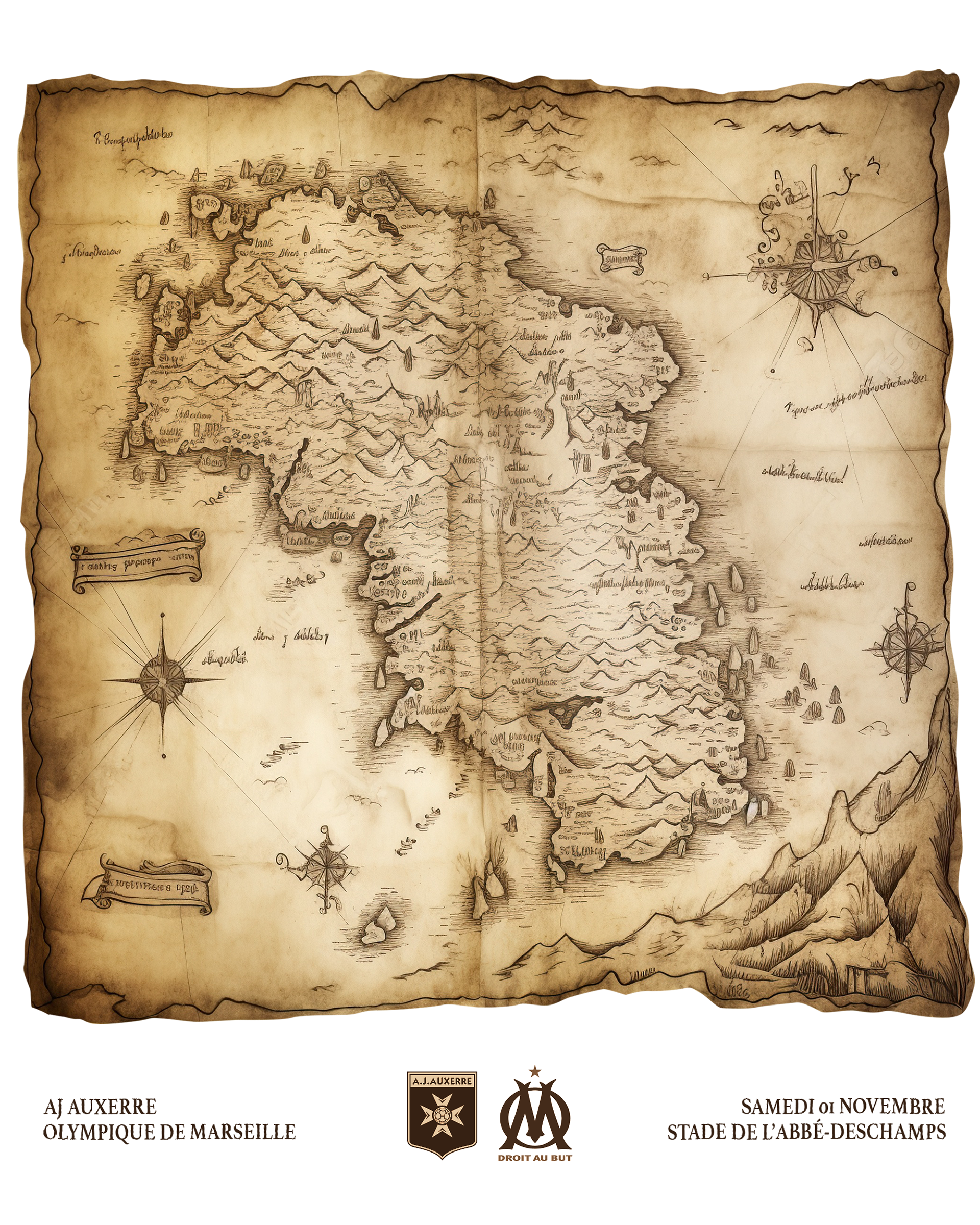 Inspired by ancient treasure maps and medieval cartography, this poster reimagines the away game against AJ Auxerre as an epic expedition: Marseille becomes a pirate vessel sailing up the mythical Yonne river, in search of the ultimate treasure: the 3 points. The Stade de l’Abbé-Deschamps is depicted as a fortress to be conquered, while the surrounding city is filled with historically inspired landmarks such as the Pont Paul-Bert and the Abbaye Saint-Pierre.